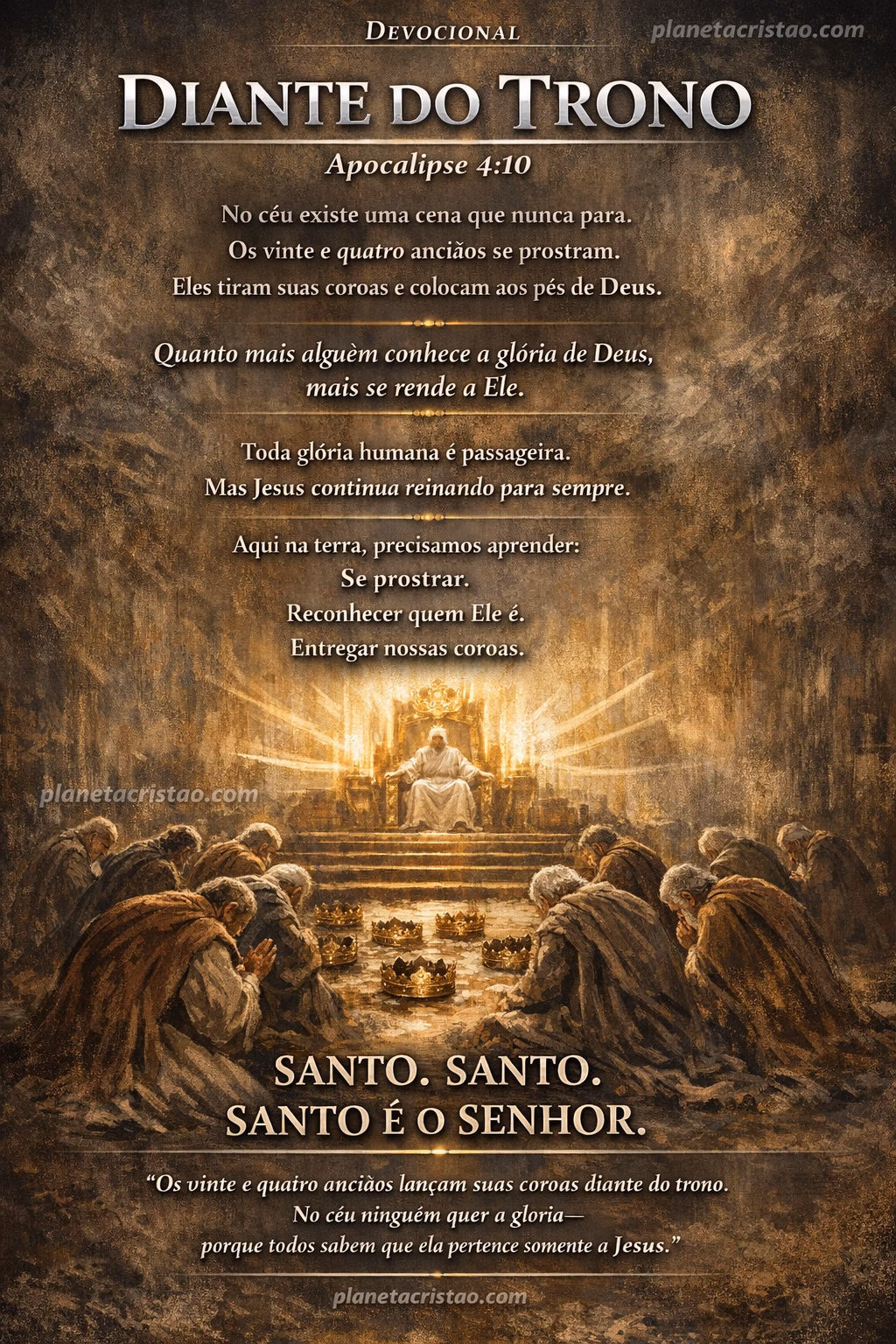 “Os vinte e quatro anciãos lançam suas coroas diante do trono. No céu ninguém quer a glória — porque todos sabem que ela pertence somente a Jesus.”